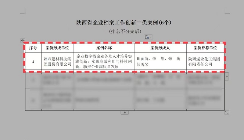近日,陜西省檔案局傳來喜訊,公司申報的《企業數字檔案業務及人才培養實踐創新:實現高效利用與持續創新,助推企業高質量發展》從征集的案例評審庫中脫穎而出,取得“陜西省企業檔案工作創新二類案例”。