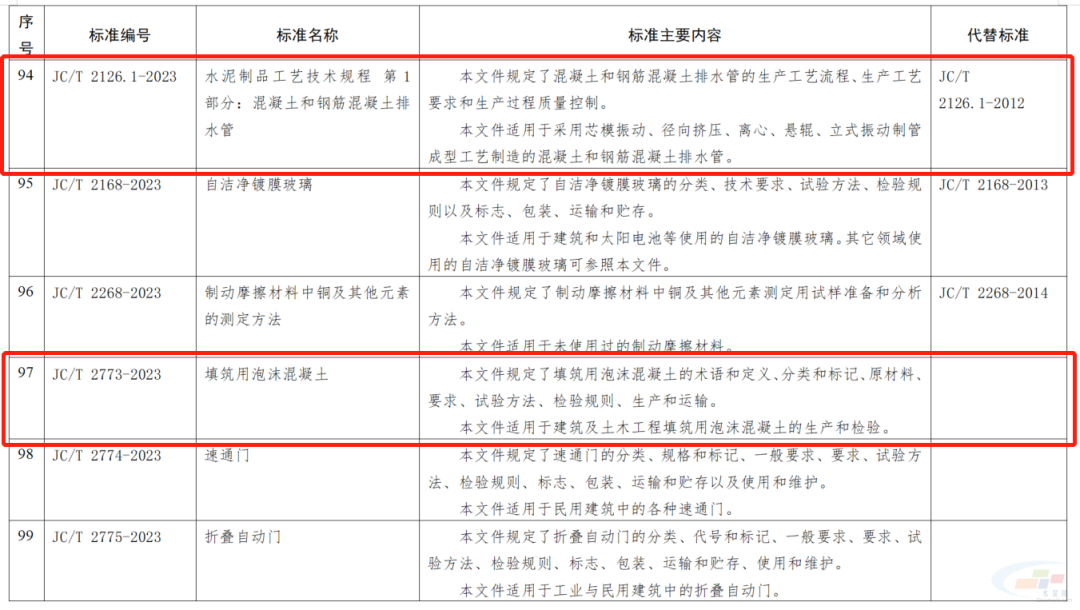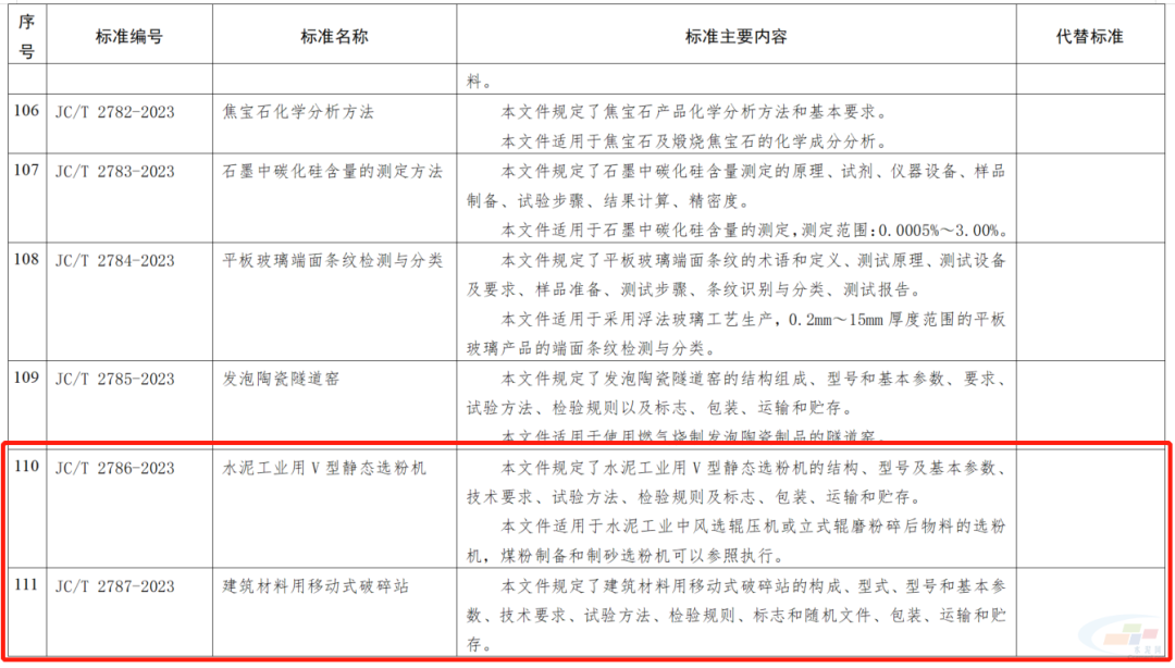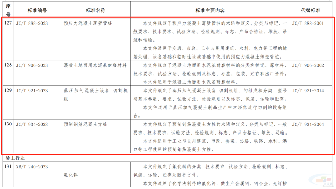 其中,水泥行業相關的,非金屬礦物和巖石化學分析方法 第2部分 硅酸鹽巖石、礦物及硅質原料化學分析方法;水泥制品工藝技術規程 第1部分:混凝土和鋼筋混凝土排水管;填筑用泡沫混凝土;公路工程用泡沫混凝土;水泥工業用V型靜態選粉機;建筑材料用移動式破碎站;石墨改性水泥基保溫板;預應力混凝土薄壁管樁;混凝土地面用水泥基耐磨材料;蒸壓加氣混凝土設備 切割機組;預制鋼筋混凝土方樁11項行業標準被列入其中。